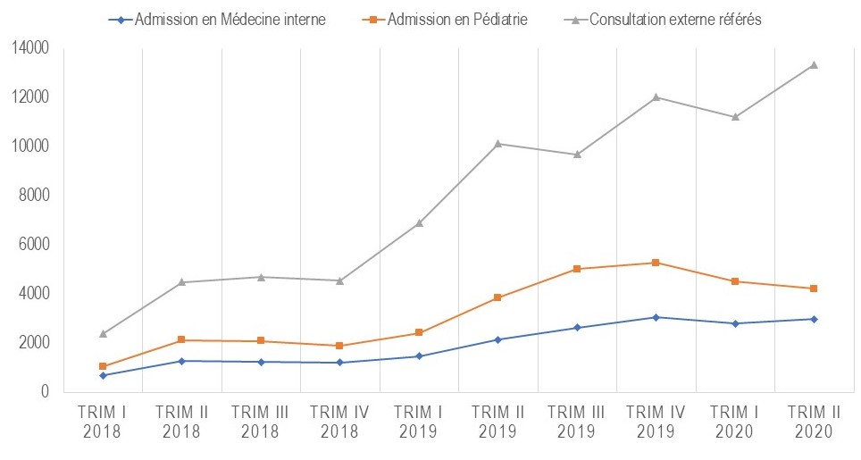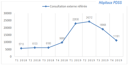 Les consultations externes référées étaient subventionnées à 100% à partir du T3 2018 dans le cadre de la riposte contre la Maladie à virus Ebola pour faciliter la surveillance épidémiologique. Au T1 2019, la courbe commence à se stabiliser. La subvention de la prestation s’arrête au T2 2019 et l’accessibilité de la population aux soins pose problème |