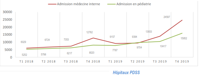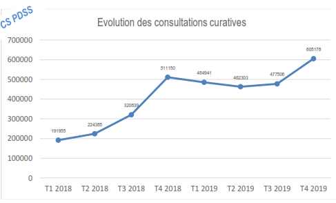 Au niveau des CS, les consultations curatives étaient subventionnées à 100% à partir du T3 2018 dans le cadre de la riposte contre la Maladie à virus Ebola pour faciliter la surveillance épidémiologique. Du T4 2018 au T3 2019, la courbe se stabilise. l’augmentation des consultations entre le T3 et T4 2019 est due à l’annonce de la fin de la gratuité des soins |